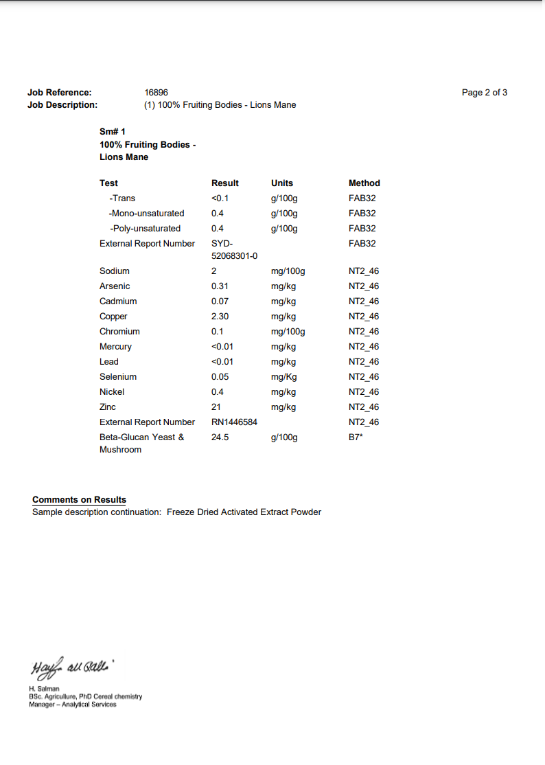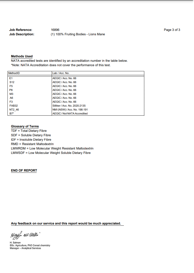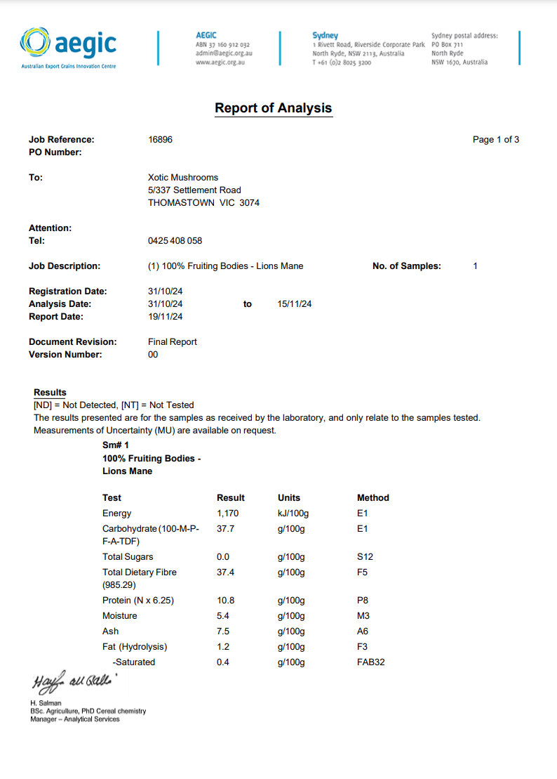 Our lab tests confirm the key nutritional values of our Lion’s Mane powder, including high dietary fibre content, minimal fat, and rich protein levels. This ensures you’re getting a product that supports your health goals naturally and effectively.